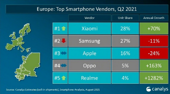 国内抢不过OV,小米转而在海外发力凶猛。据国际数据机构Canalys发布的最新数据显示,2021年Q2季度,小米在65个国家和地区智能手机市场占有率排名前五,在22个国家和地区智能手机市场占有率排名第一。