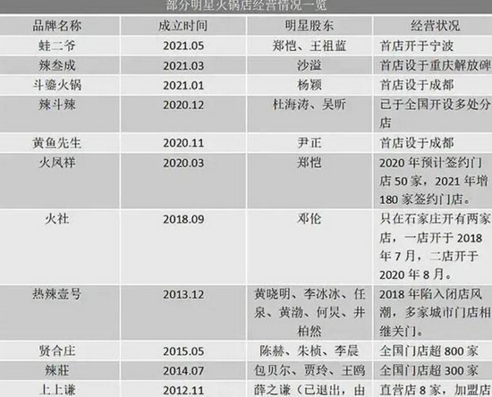 陈赫的“贤合庄”,薛之谦的“上上谦”,杨颖的“斗鎏火锅”,沙溢的“辣叁成”,杜海涛的“辣斗辣”,胡海泉的“灥喜锅”……其中“贤合庄”可谓其中的“王者”,从2015年开业,如今全国门店已超800家。2020年10月,郑恺、王祖蓝的“火凤祥”第一家店开业,短短2个月加盟店数量达到50家。