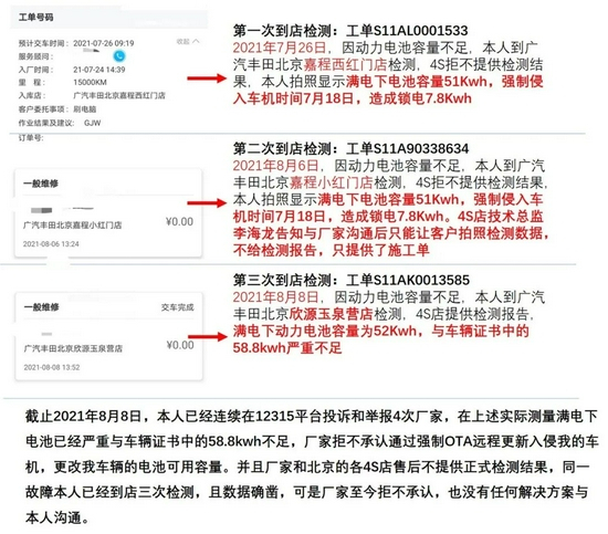 去年三月底买的广汽丰田iA5电动汽车,今年七月底却感觉续航突然减少了。刘龙(化名)怀着满腔疑惑,来到了销售汽车的4S店。一番检测过后,刘龙找到了续航减少的原因——满电状态下,电池容量仅有51kWh,与车辆证书中的58.8kWh相比,下降了13.27%,换算到续航里程上约减少了67.68公里。