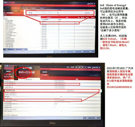 刘龙将这些变化归咎于广汽丰田于7月18日进行的对BMS(电池管理系统)的OTA(远程升级技术)更新。他遇到的OTA“锁电”经历,正在更多的电动车车主身上发生。锁电,即对SOC(电池荷电状态)的锁定,能够限制电池的充电放电从而改变电池容量、充放电速度。