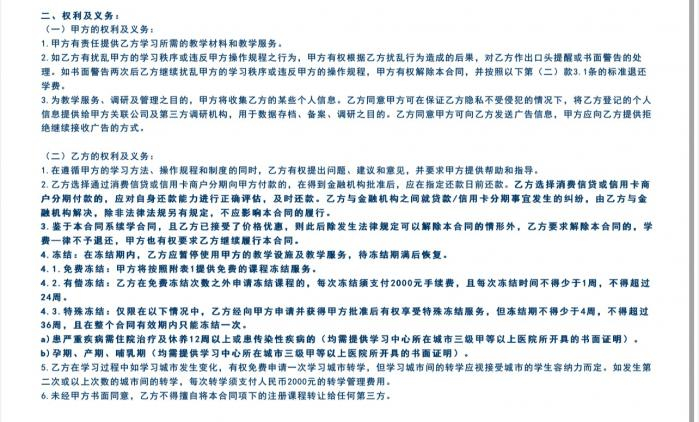 比如,甲方的责任仅有一条“提供乙方学习所需的教学材料和教学服务”,其权利包括在乙方扰乱学习之需或者违反操作规则的时候有权口头提醒、书面警告甚至解除合同并退部分学费;可以为了教学服务、调研和管理收集乙方的某些个人信息,并提供给关联公司和第三方调研机构;乙方还得同意甲方发送广告信息。