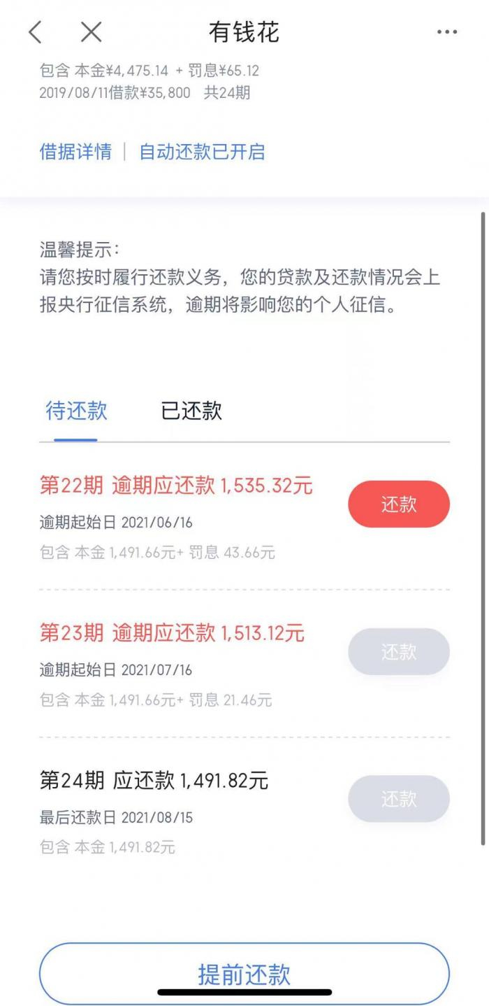 根据学员提供的“百度有钱花”的借款截图,6月16日和7月16日他已经连续两期没有归还,也被追加了罚息,该机构提示:请按时履行还款义务,贷款以及还款情况会上报央行征信系统,逾期将影响个人征信。