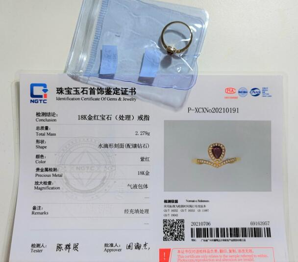 随后,兰女士将红宝石戒指送至NGTC(国家珠宝玉石质量监督检验中心)复检,于7月5日收到鉴定证书,显示该商品为18K金红宝石(处理)戒指,备注经充填处理,这意味着该枚戒指并非裙子姐姐所言天然红宝石,而是经人工充填处理的“假货”。