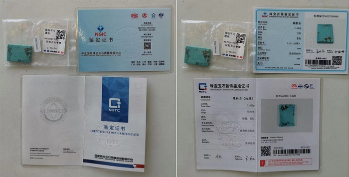 “绿松石无事牌(检验编号:NGO27090899)”裙子姐姐提供的NGIC(中金国检珠宝玉石质量检验中心)珠宝首饰鉴定证书显示,该商品鉴定结果为:绿松石,总质量7.69g,颜色蓝色,放大检测为“隐晶质结构”。消费者同样送至NGTC复检,鉴定证书检测结论却显示:绿松石(处理),总质量7.665g,颜色绿蓝、棕红,放大检测为“致密块状构造”,备注为“充填处理”;