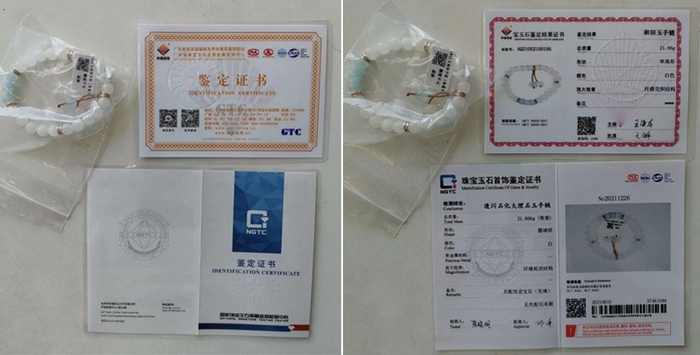 如“裙子姐姐”直播间所售“和田白玉圆珠手链(实验号:AQ21052100195)”,其提供的中国GTC(广东省珠宝玉石及贵金属检测中心)宝玉石鉴定证书显示,该商品鉴定结果为:和田玉手串,总质量21.66g,颜色白色,放大检测为“纤维交织结构”。但消费者送至NGTC复检,鉴定证书检测结论却显示:透闪石化大理石玉手串,总质量21.868g,颜色白,放大检测为“纤维粒状结构”,备注“另配海蓝宝石(充填)”;