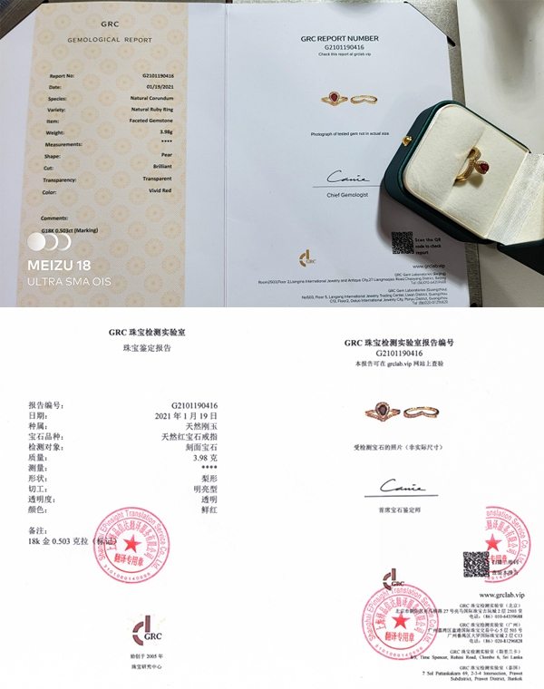 今年3月6日,兰女士在“裙子姐姐”直播间花费4980元购买了一枚18K金红宝石戒指,据“裙子姐姐”介绍,戒指上的红宝石为天然红宝石,且配有GRC珠宝鉴定报告。收到戒指后,兰女士一直精心收藏,并未对其产生怀疑,直到今年6月沉香“套证”事件发生后,不断有消费者举证“裙子姐姐”出售的珠宝产品送检“翻车”,她才警惕起来。