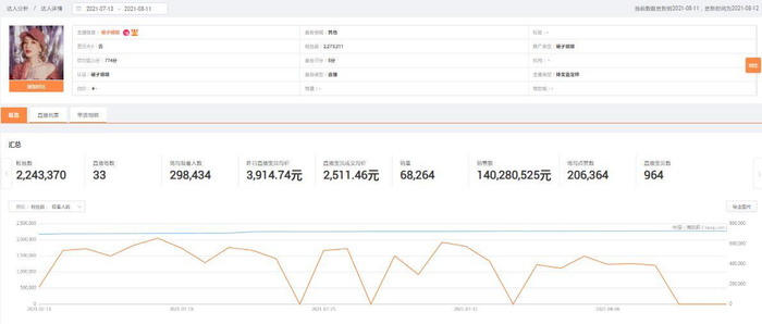 据“裙子姐姐”所在电商平台统计数据,今年7月13日至8月11日,“裙子姐姐”共完成33场直播,直播产品成交均价约2511元,直播产品数964个,直播间销售额超1.4亿元。
