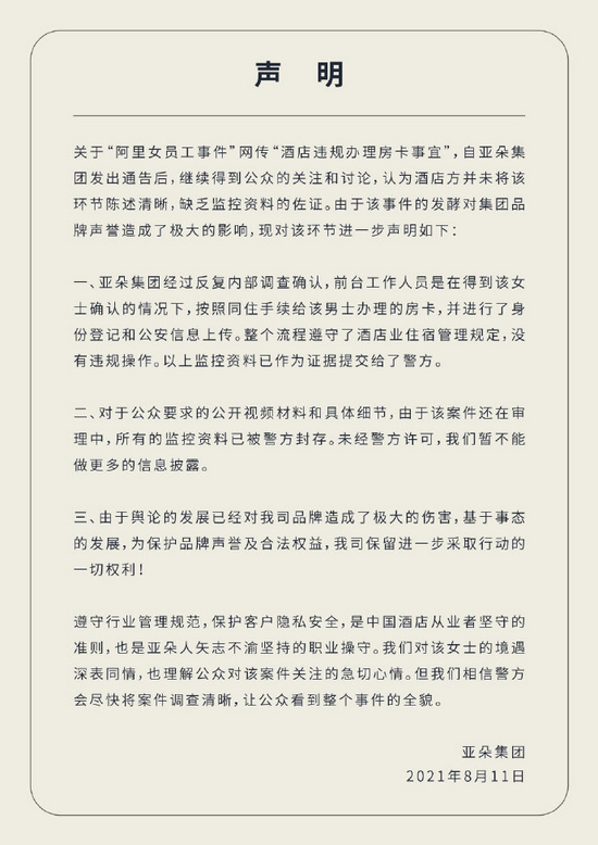 随后,亚朵酒店分别在8月10日和11日连发两次声明,称其不存在违规制作房卡的情况:“前台工作人员在得到了该女士的确认的情况下,按照同住手续给该男士办理的房卡。”然而,这一说法随即被打脸。