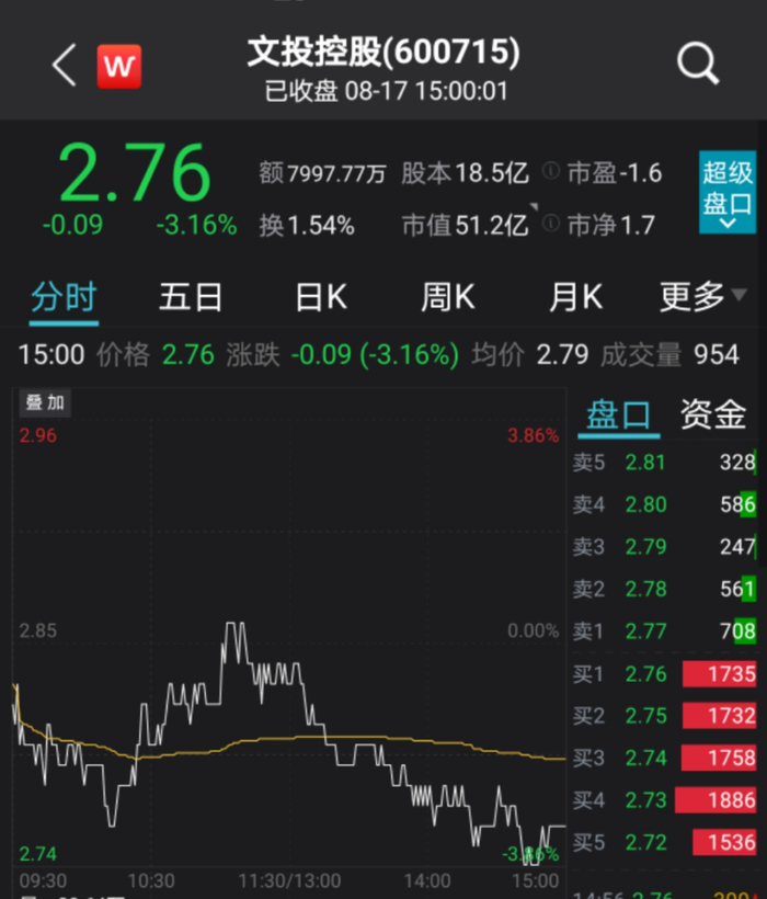 A股公司文投控股(600715)今日收盘跌3.16%,股价报收2.76元/股。