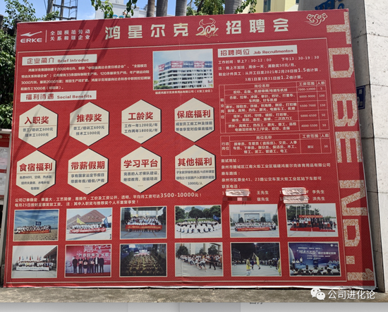贝壳财经记者同时注意到,鸿星尔克在两个厂区门前都打出了招聘广告,这似乎印证了鸿星尔克缺工的现状。