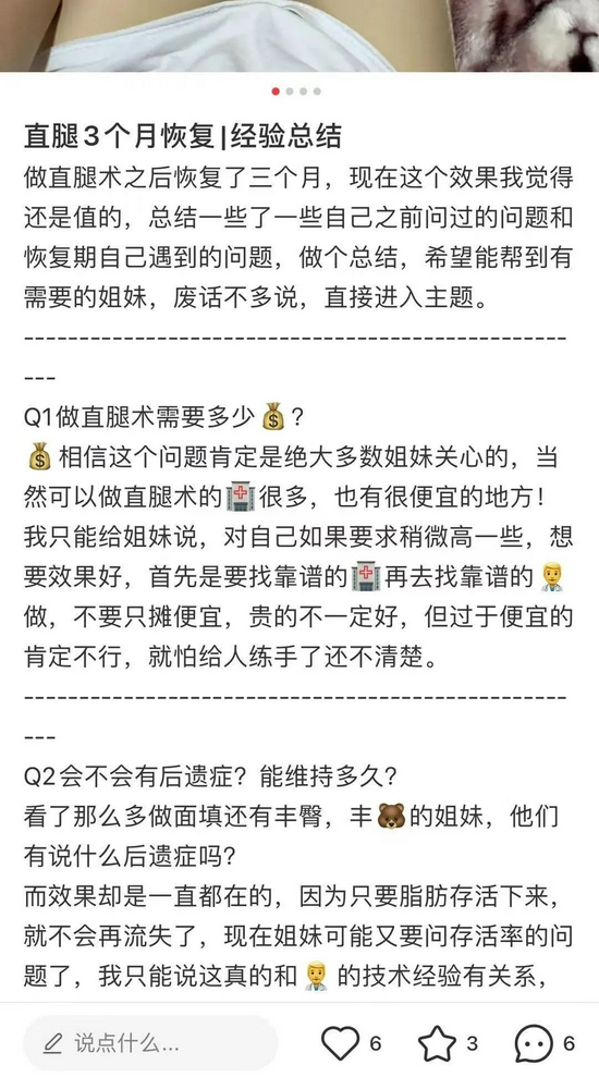 上述“博主”实为医美中介,并迅速推介了“瘦腿针”和“抽脂”两个医美项目,声称“往往项目做得越多,效果越好”。据对方介绍,瘦腿针即注射肉毒素,一般能维持3-6个月,此后还需继续注射,三次即能达到永久效果,每针价格大概在2000元-3500元,进口的每针需要将近6000元。抽脂的话,一次即有永久效果,但需进行手术,一台抽脂手术的费用大约在1万多元。这名中介强调,为维持手术效果,不能剧烈运动。对于《财经》E法提出的所有担忧和疑问,“找正规的医院和靠谱的医生很重要,一切都不是问题”成了一句万能回答。
