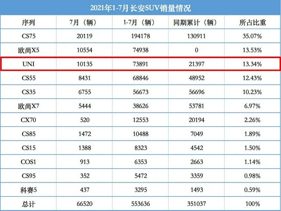 中国汽车工业协会数据显示,今年1-7月,UNI序列总销量为73891辆,较去年同期增长345%,包括欧尚在内,在长安汽车旗下SUV车型销量中,排名第三,占到旗下SUV整体销量的13.34%。