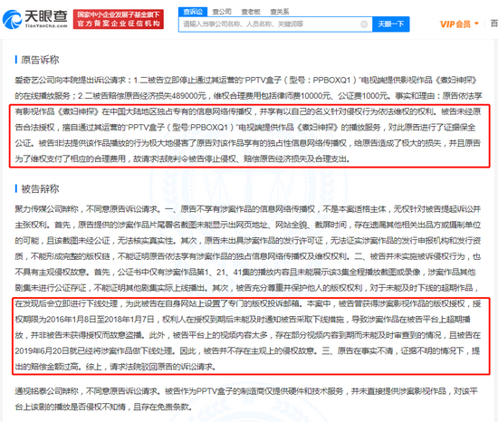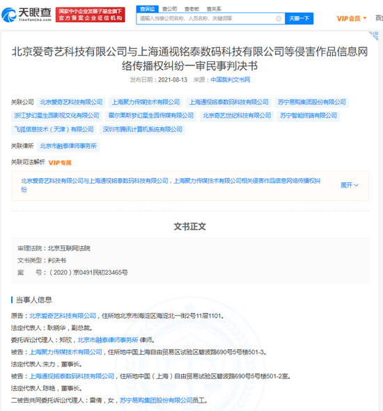 天眼查App显示,近日,两则北京爱奇艺科技有限公司与上海通视铭泰数码科技有限公司等侵害作品信息网络传播权纠纷一审民事判决书公开,审理法院为北京互联网法院。