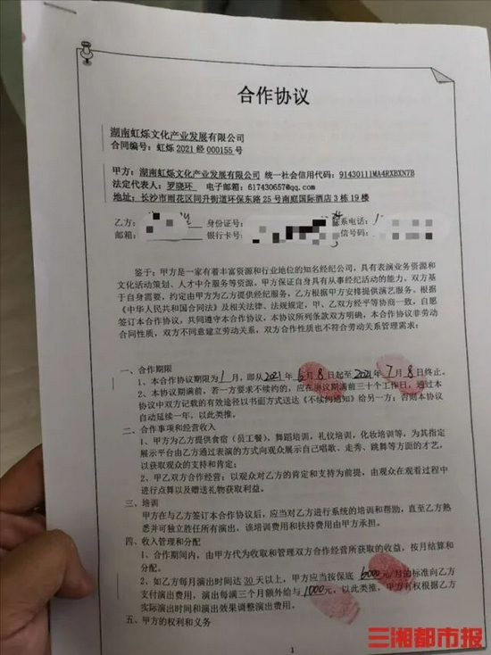 5月底,湖南虹烁文化产业发展有限公司(简称虹烁公司)主动联系她,称公司正招聘有经验的舞蹈演员,兼职员工月薪5000元起,正式员工6000元起,提成另算。6月1日,小任带着60元钱出门来长,“坐车、吃饭,到公司的时候,身上只剩下一块钱了。”