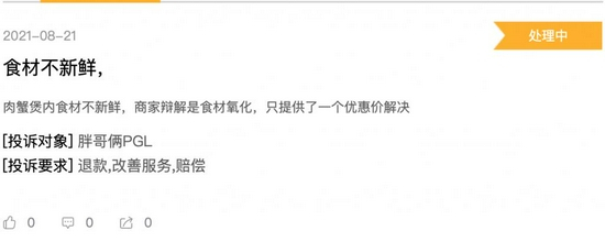 有消费者匿名投诉称,食材不新鲜。其提供的图片显示,疑似姜片或土豆的食材发黑。此外,还有多位消费者投诉称 “ 吃出头发 ”、“ 吃了腹泻 ” 等。