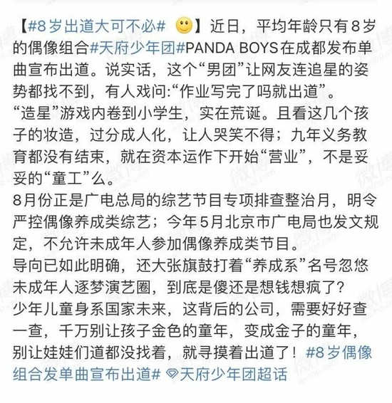 8月21日,“天府少年团”所属公司发文回应质疑,强调公司不是把孩子当作赚钱的工具,而是在孵化具有时代意义的新一代少年榜样。他们当中不仅有学科代表,还有三好学生。对成员的第一条要求就是在保证学习的前提下,再完成艺术训练。