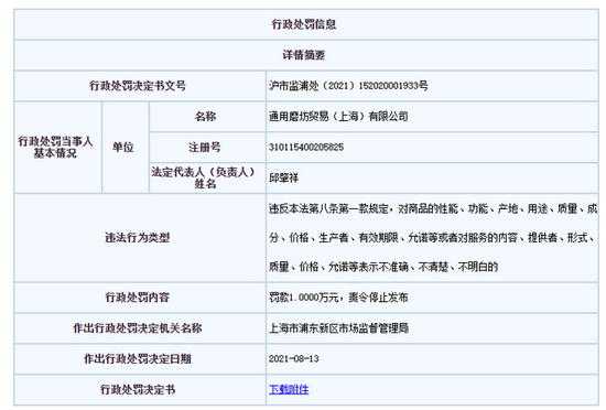 为此,上海市浦东新区市场监管局对通用磨坊作出责令停止发布违法广告和罚款10000元的处罚。