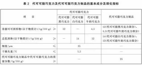 而代可可脂巧克力的定义则是,“以白砂糖、代可可脂等为主要原料,添加或不添加可可制品、乳制品及食品添加剂,经特定工艺制成的在常温下保持固体或半固体状态,并具有巧克力风味和性状的食品”。