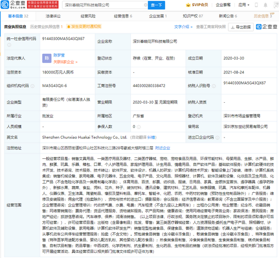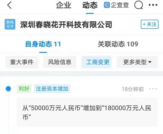 企查查APP显示,8月24日,深圳春晓花开科技有限公司发生工商变更,公司注册资本由5亿元人民币增加至18亿元人民币,增幅260%。