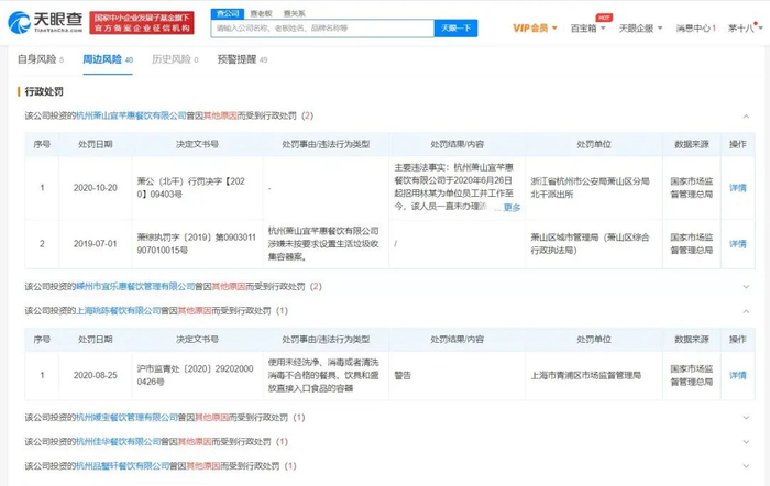 天眼查风险信息显示,多家胖哥俩子公司因“卫生安全”问题被行政处罚,如上海姚陈餐饮有限公司曾因使用未经洗净、消毒或者清洗消毒不合格的餐具被警告;杭州萧山宜芊惠餐饮有限公司因未按要求设置生活垃圾收集容器被处罚等。