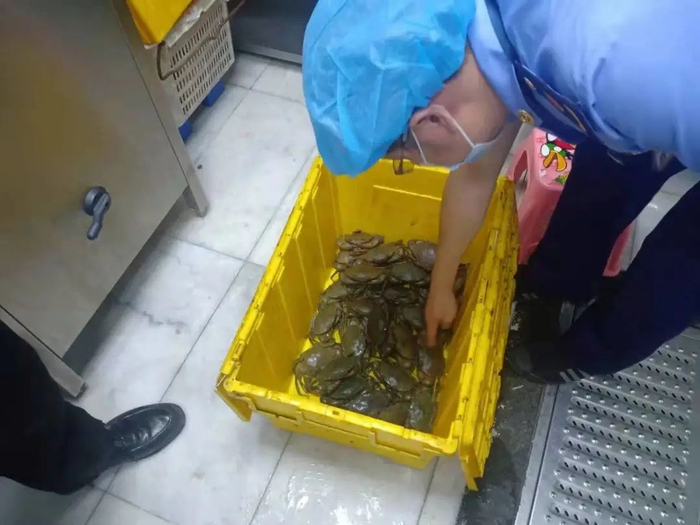 据南昌晚报,记者随同南昌市市场监督管理局、南昌市市场监督执法稽查局红谷滩分局的执法人员一起来到胖哥俩肉蟹煲世茂店进行突击检查。