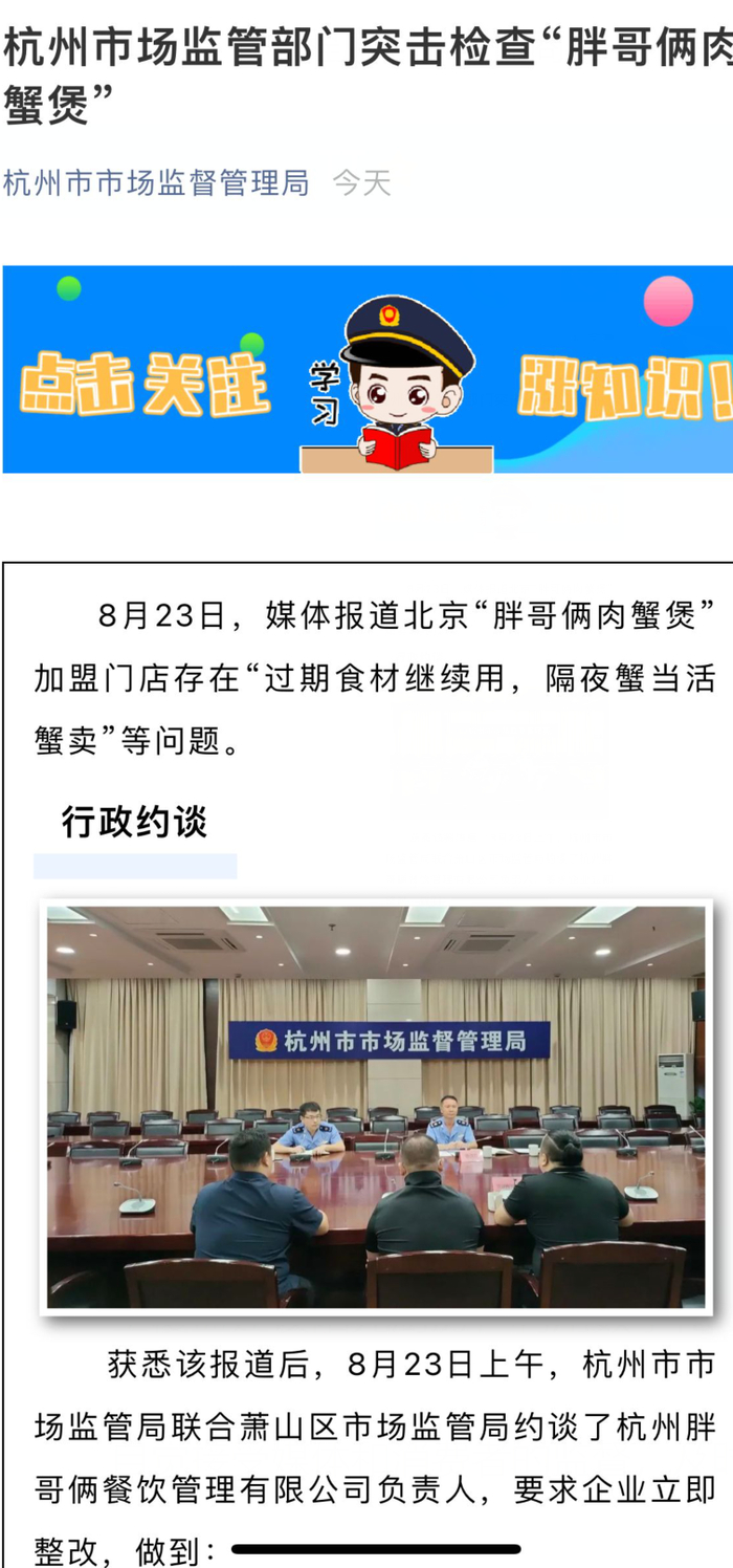 获悉该报道后,8月23日上午,杭州市市场监管局联合萧山区市场监管局约谈了杭州胖哥俩餐饮管理有限公司负责人,要求企业立即整改,做到: