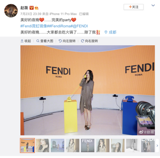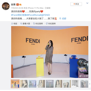 2021年7月23日,FENDI在成都天府新区举办霓虹派对展示2021秋冬男士系列产品,赵薇身着一身驼色系套装压轴出场。这是她最近一次和FENDI的公开活动,当天活动结束,赵薇发了条微博,“美好的夜晚,完美的party”,并@FENDI。