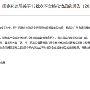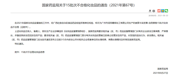 中国网财经8月31日讯(记者杜丁 实习记者安荻)昨日,国家药监局发布关于15批次不合格化妆品的通告(2021年第67号)。