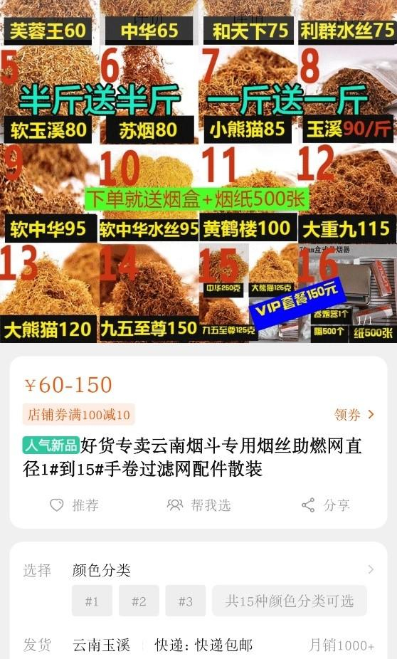 一些淘宝店铺甚至销售多种“名烟”烟丝。此前一家名为“tb108405149的小店”(编注:该店铺已消失)的淘宝店售有宣称为“芙蓉王”、“中华”、“和天下”、“黄鹤楼”等15种品牌的烟丝。客服称,现在买半斤送半斤,即60-150元一斤,还送烟盒和烟纸。平台显示该商品月销量超过1000。