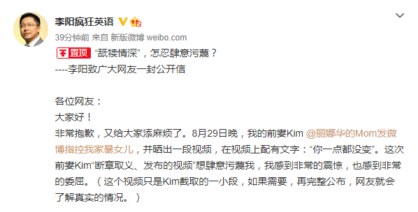 8月31日,李阳微博转发北京市一法律师事务所律师周兆成发布的声明,声明称受李阳委托,该事起因系“李阳先生与其前妻Kim女士在女儿教育方式上存在分歧”,但是指控李阳先生“家暴女儿”存在严重失实。声明称李阳作为公众人物“没有处理好家庭事务”,李阳就“该事件”无条件向公众道歉。当天下午,李阳微博也发文否认前妻的相关指控,其称视频只是Kim截取的一小段,“如果需要,再完整公布”。