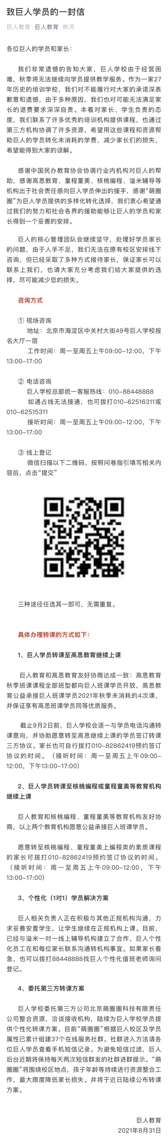 8月31日晚间,巨人教育在官方微信公众号发布文章称,由于经营困难,秋季将无法继续提供教学服务,可能无法满足退费要求,巨人教育学员可转课至高思教育、核桃编程等机构继续上课。