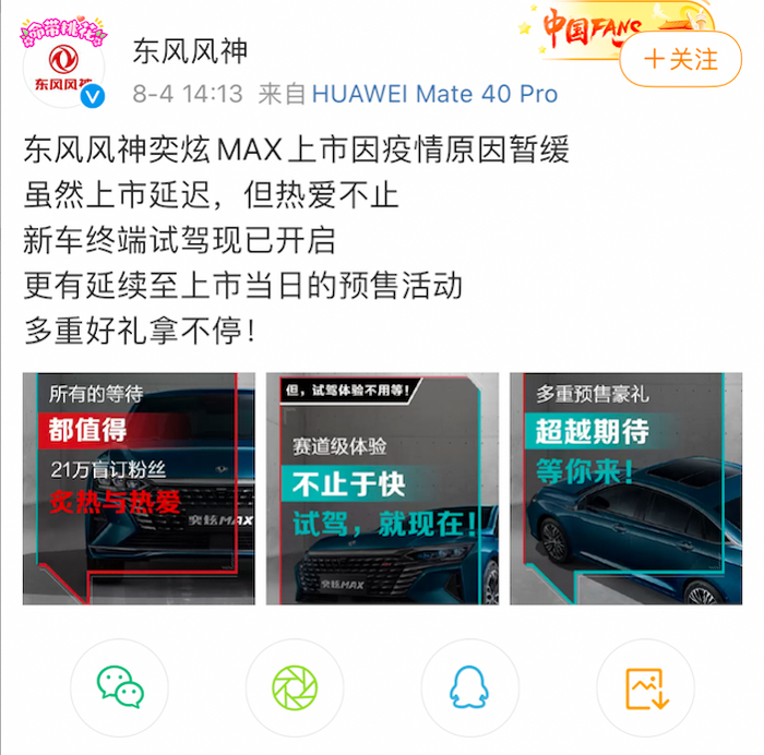 8月4日,东风风神官方微博发布新海报,对风神奕炫MAX上市推迟表示抱歉,但海报上却赫然写着:“所有的等待都值得21万盲订粉丝炙热与热爱”。对此,不少消费者对“21万”盲订粉丝这一数据抱以质疑:“该车自7月9日开启预售以来,仅相隔26天怎么可能有21万用户预订?”