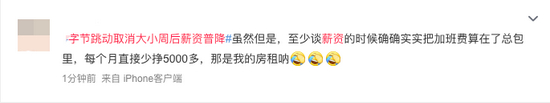 对于字节员工的“哀嚎”,许多网友并不理解。在话题“字节跳动取消大小周后薪资普降”下,有不少网友都疑惑到:“只是加班费没了,怎么能等于薪资普降?”