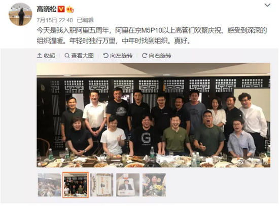 2020年7月15日是高晓松入职阿里5周年。阿里部分在京高管为他举行了庆祝聚会。
