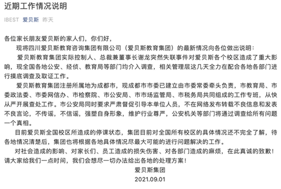 声明指出,爱贝斯集团目前对全国所有校区的具体情况还不完全了解,待各地情况清楚后,集团将根据各地具体情况,尽最大可能进行问题解决工作。并恳请多给一些时间,会想尽一切办法给出各地处理方案。