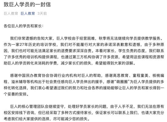 8月31日,成立于1994年的大型基础教育培训机构巨人教育公告,由于经营困难,秋季无法继续向学员提供教学服务,由于多种原因,可能无法满足家长的退费要求。