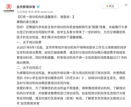 证券时报记者发现,近日,多地教育部门发出公告,指出近期多家教培机构因资金断裂出现跑路现象,提示家长谨慎选择培训机构、谨慎缴纳培训费用,并签订正规的培训合同。