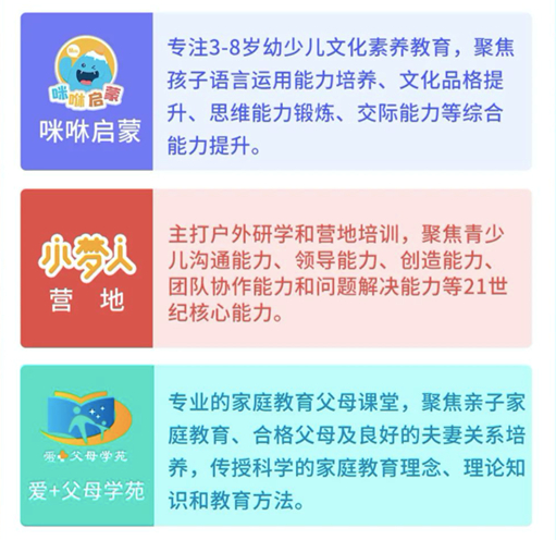 7月1日,爱贝斯发布公告称,为了顺应国家政策和社会需求,公司全面布局素质教育业务板块,并以此打造全新的课程体系,包括3-8岁幼少儿文化素养教育,户外研学和营地培训,家庭教育父母课堂等。