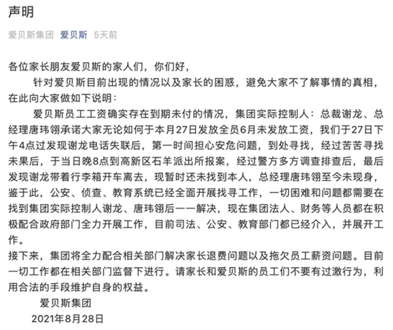 近日,知名英语培训机构爱贝斯公告,公司实控人、总裁谢龙自8月27日带着行李箱失联,至今未找到。目前公司因家长退费及拖欠员工薪资问题被推上风口浪尖。