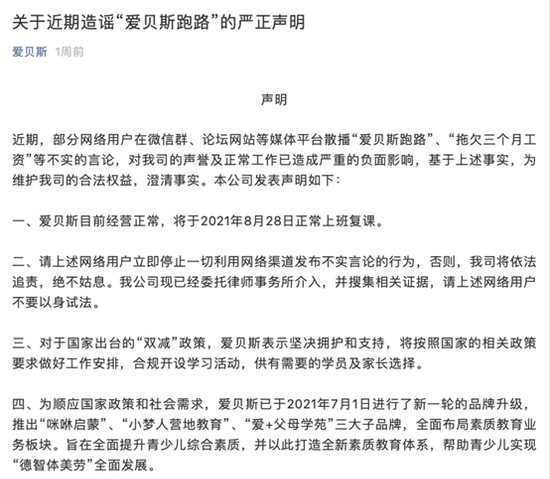 值得注意的是,就在该声明发出前2天,8月26日,爱贝斯通过微信公众号发布声明称,部分用户散播“爱贝斯跑路”等不实言论,给公司的声誉和正常工作造成严重负面影响。爱贝斯目前经营正常,将于2021年8月28日正常上班复课。