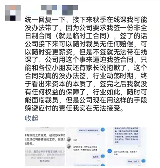有学而思老师表示,该非全日制合同等同于“临时工合同”,签了之后,公司接下来可以随时裁员无需任何赔偿,也可以随时变更薪资,但是不签合同就无法继续带在线课程,“公司用这样的方式躲避应付的责任,实在无法接受。”