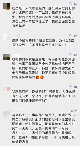 不过,在这份公告下面,大量家长留言,对公司的解释表示不满,要求公司尽快退款。