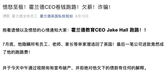 8月13日,主要从事留学咨询业务的霍兰德教育通过官方公众号发布声明称,公司CEO Jake Hall于7月底隐瞒所有员工、老师、家长等举家潜逃回英国后,通过视频匆匆宣布破产,并拒绝对欠下的债款做任何解释。