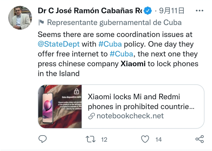 古巴驻美大使卡巴纳斯(Jose Ramon Cabanas)评论称,“美国国务院在古巴政策问题协调上似乎出了一些问题。一方面他们声称要向古巴提供网络自由,另一方面他们又施压小米公司封锁岛上的手机。”