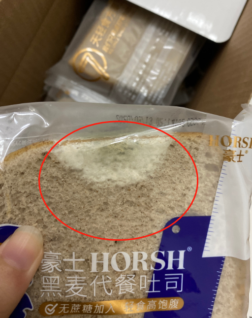 无独有偶,有消费者2019年4月投诉称,其在天猫超市购买的豪士口袋面包,也在保质期内出现发霉的现象。