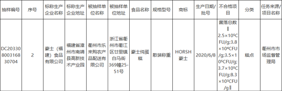 2020年9月,豪士纯蛋糕被检出菌落总数超标。据浙江省衢州市市场监督管理局食品安全监督抽检信息显示,标称衢州市乐来购农产品配送有限公司销售的、豪士(福建)食品有限公司生产的豪士纯蛋糕(生产日期/批号:2020/6/8)被检出菌落总数超标。
