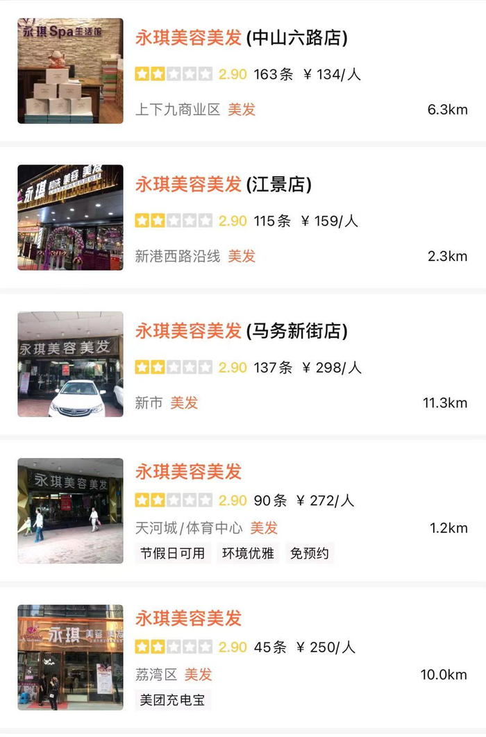 大众点评显示,目前永琪在广州门店共有包括体育西路店、江景店在内的6家门店。
