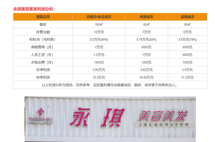 根据加盟费查询网的数据,一家位于直辖市/省会城市、面积100㎡的永琪美容美发加盟店,预估月净利5.85万元,年净利有70.2万元。