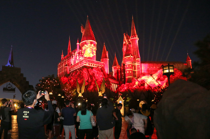 看过环球大巡游之后,不妨前往哈利·波特的魔法世界™等待霍格沃茨™城堡夜间灯光庆典。这里上演了一段关于霍格沃茨™四所学院的宏伟篇章,奇幻色彩和璀璨光影在一瞬间迸发,仿佛眼前静静矗立的城堡都拥有了生命。