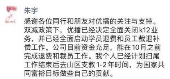 9月13日,新东方在线副总裁、东方优播CEO朱宇发布朋友圈称,新东方在线已决定全面关闭旗下K12业务东方优播,并已全面启动学员退费和员工裁退补偿工作。公司目前资金充裕,预计将在10月之前完成退费和裁员工作。而朱宇本人则计划前往山区支教,为共同富裕做贡献。